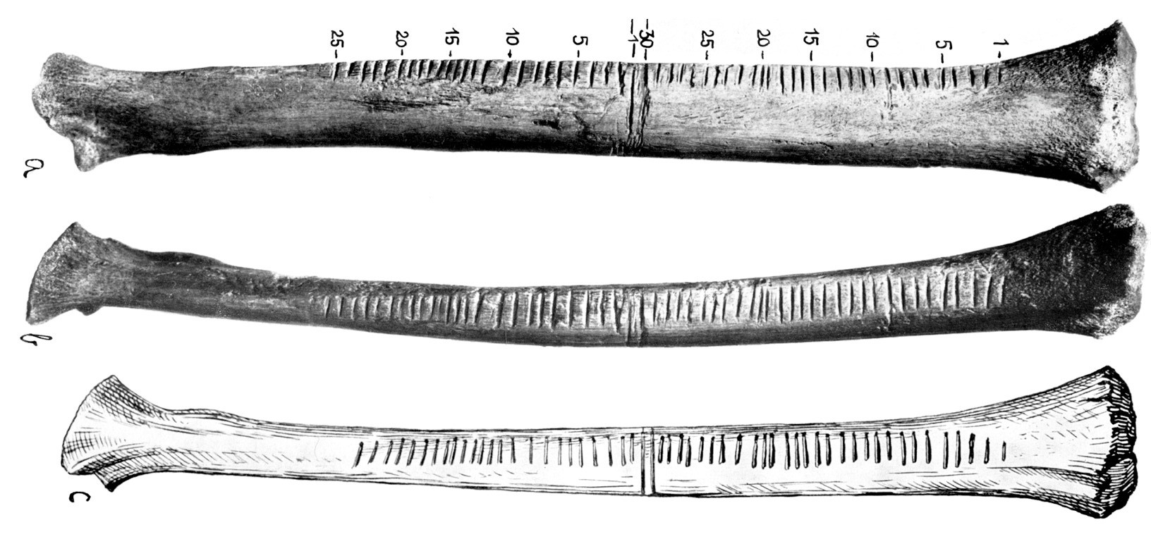 – una prima serie di 25 tacche, raggruppate a gruppi di 5; – una seconda serie di 30 tacche, separata dalla prima da due segni.